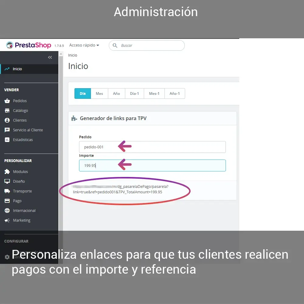 - Configura en el enlace información del pedido, importe, referencia, etc.